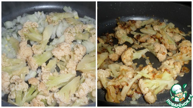 • На сковороде на растительном масле обжариваем лук и цветную капусту 5-7 минут.