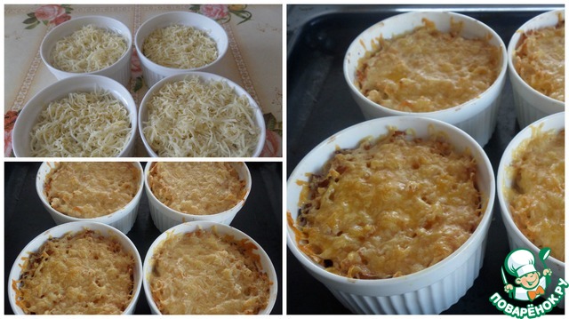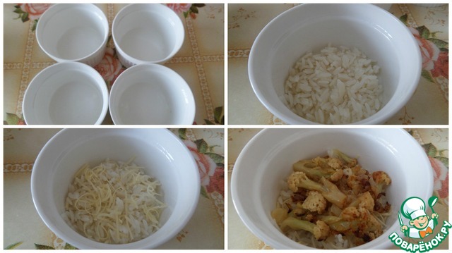 • Формочки смазываем сливочным маслом. На дно формочки кладем рис, затем щепотку натертого сыра, затем - обжаренный лук с цветной капустой.