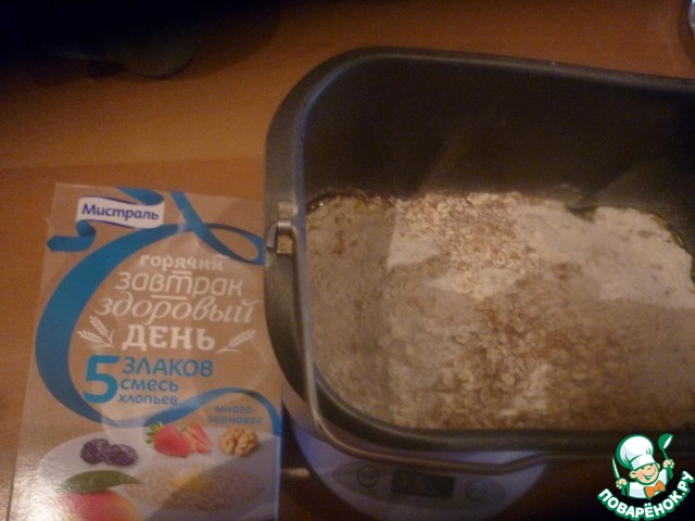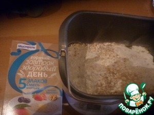 Установить нужную программу: у меня хлеб из цельнозерновой, вес 750 гр, корочка - средняя. После того, как ХП последний раз помешает тесто ( у меня это где -то за 1,5 часа до окончании программы) посыпать сверху немного хлопьями.