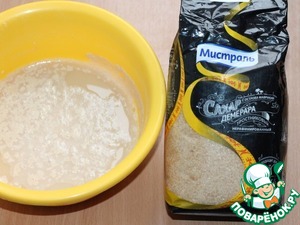 2. Приготовим опару для булочек. Смешать 1 ст. л. муки, дрожжи, 2 ч. л. сахара со 100 мл теплой воды. Поставить опару в сторону для подъема.