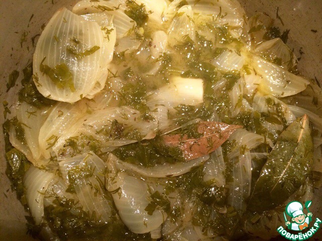 Заливаем бульоном 150 мл, белым вином, кладём зелень, тимьян солим, перчим. И варим на медленном огне 40 минут.