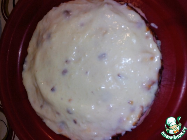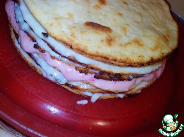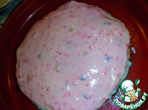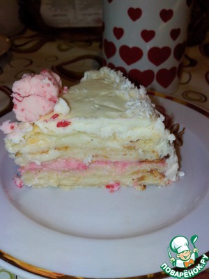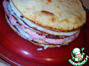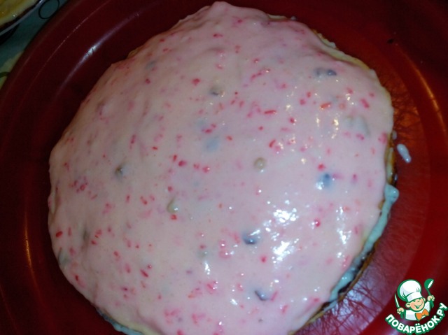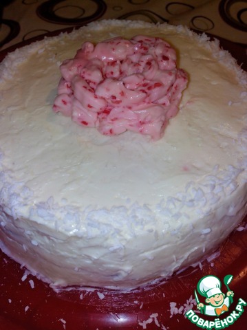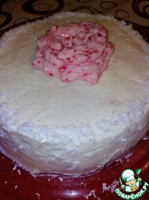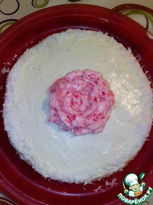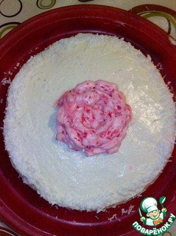 В оставшийся крем добавляем кокосовую стружку с красным красителем и промазываем один корж.