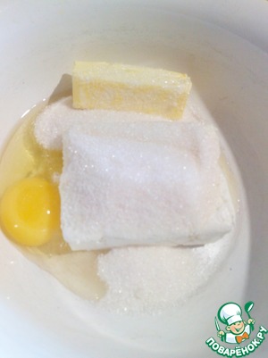 Коржи. Смешать творог, яйцо, сахар и масло.