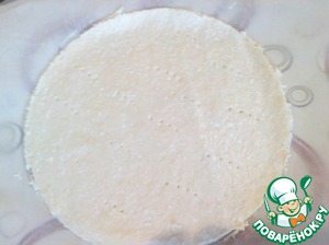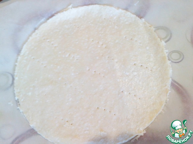 Добавить муку и замесить тесто. Разделить на шесть частей. Каждый раскатать через пищевую плёнку на смазанной сливочным маслом бумаге для выпечки нужного диаметра. Обрезать по тарелке. У меня диаметр 20 см.