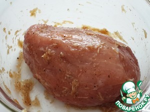 Кусок свинины натрите солью, перцем, соевым соусом и чесноком.