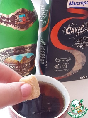 В остывший чай добавьте коричневый сахар (я использовала Мистраль Демерарра) и половину коньяка, размешайте до растворения сахара