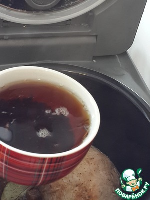 Теперь влейте заваренный чай с сахаром и коньяком (можно вместе с чаинками) И на программе "Тушение" с закрытой крышкой томите мясо в течение 1 часа.