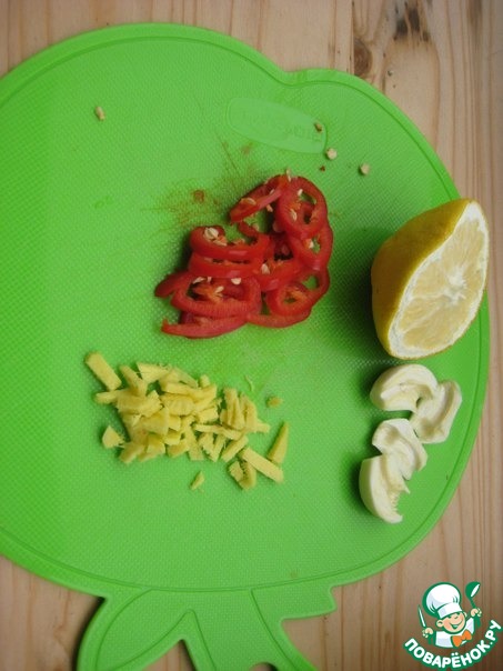 Кусочек имбиря почистить, мелко порезать. Нарезать перец чили.