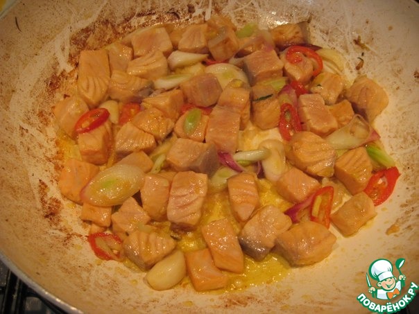 В сковороду влить 1 ст. л. оливкового масла, выложить семгу вместе с маринадом и луком, обжарить 3-4 минуты.