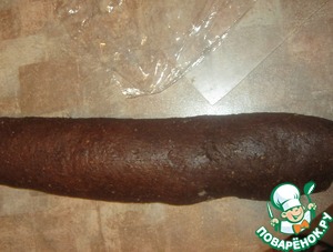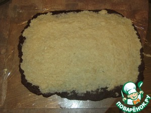 На пищевую пленку выложить смесь из печенья, растянуть в прямоугольник