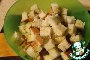 Кубики батона разложить на противне, застеленного пергаментом и поставить в заранее разогретую до 180 градусов духовку, на 10-15 минут.