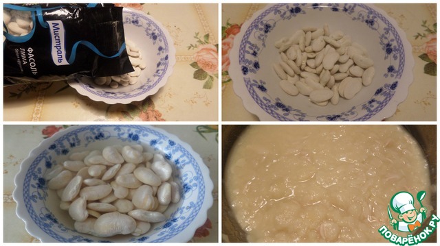 Отмеряем необходимое количество фасоли. Заливаем водой. Оставляем на ночь. Утром воду сливаем, добавляем чистой воды (1:5) и варим до готовности. Солим. Остужаем. Убираем оболочку от фасоли. Пюрируем блендером. ( Я использовала 250 г фасолевого пюре).