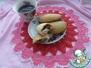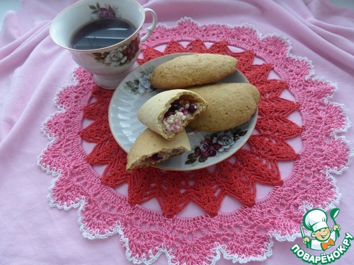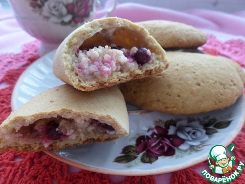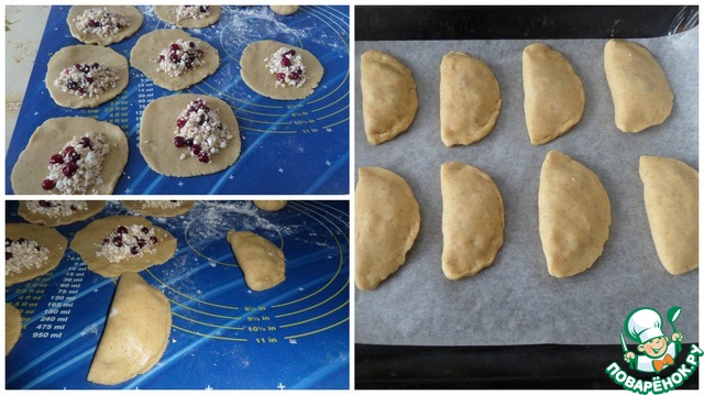 Достаем тесто и делим на 16 частей. Раскатываем каждую часть теста в лепешечку. Выкладываем на одну половину лепешки 1 ст. л. с горкой творожно - клюквенной начинки. Накрываем второй половиной лепешки. Прижимаем пальцем края сочня. Выкладываем приготовленные сочни на противень.