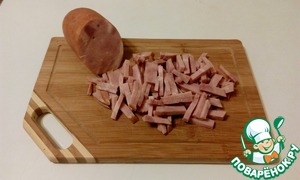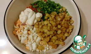 Картофель режем не большими кубиками и обжариваем на растительном масле до готовности, под конец жарки солим, остужаем. Важно правильно пожарить картофель! Для этого мы картофель кладем на разогретую сковороду в один слой, чтобы он не слипался. Долго не жарим, чтобы он в салате не превратился в кашу. Соломкой резать не советую потому, что она при перемешивании ломается. Вообщем картофель должен быть румяным, готовым и тверденьким)))