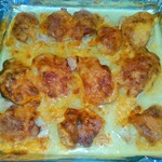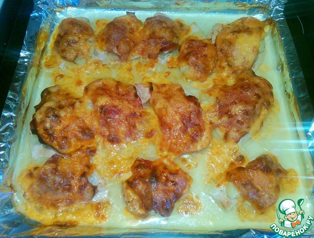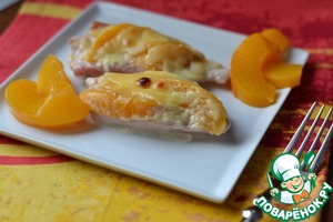 [+4]Блюдо очень простое в приготовлении. Делал вчера с ананасами, т.к. в нашей семье печеные персики совсем никому не нравятся, извините. Фольгой сверху не накрывал, за 10 минут до готовности поднял в верх духовки и включил гриль для подрумянивания. Все прекрасно получилось (см. фото), блюдо понравилось и жене, и дочери.