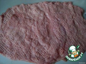 Кусок мяса разрезать по ширине и отбить, посолить, поперчить.