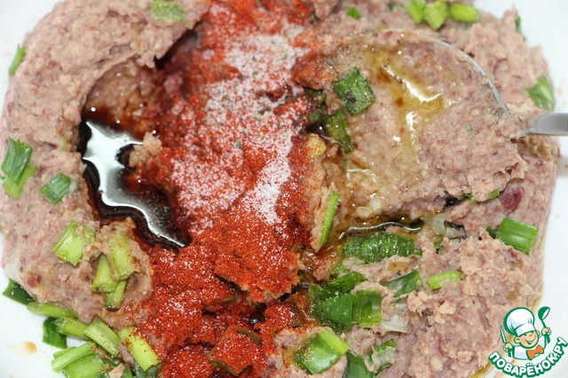 К полученному фаршу добавить рубленный зеленый лук, соевый соус, ложку растительного масла, сухую паприку и тщательно вымесить. Как на котлеты.