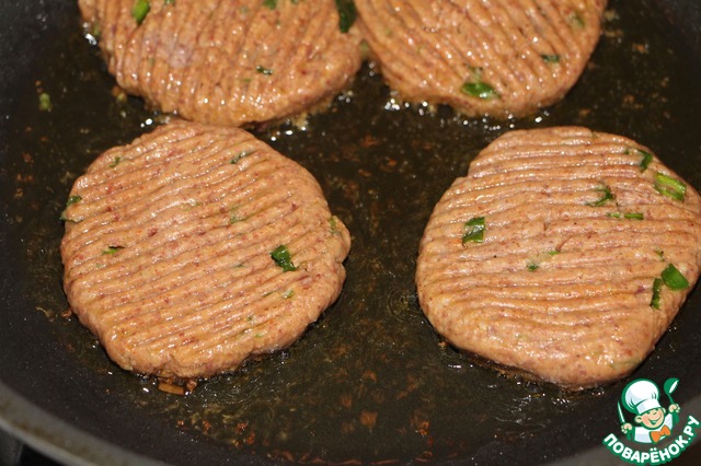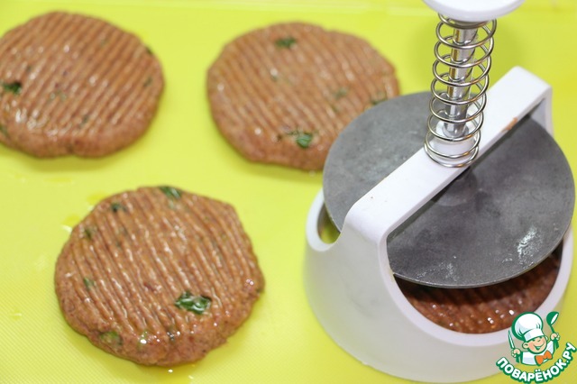 При помощи специального приспособления для бургеров, котлеты сплющить (или рукой и вилкой, или картофелемялкой, смазанной маслом, фарш довольно липкий)