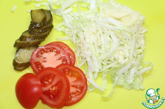 Подготовить овощи. Булочку разрезать пополам, смазать любимым соусом, выложить овощи и котлету