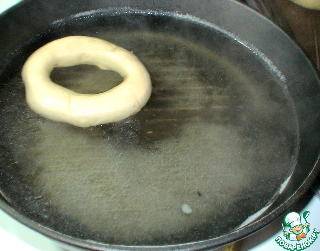 Бублик выкладывать в воду швом вниз, на 5 секунд, переворачиваем на другую сторону на 5 секунд. -