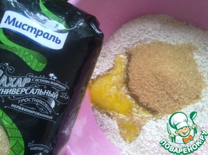 Яично-масляную смесь, влить в сухие ингредиенты, добавить тростниковый сахар ТМ "Мистраль" и перемешать.