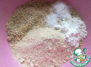 Измельченные овсяные хлопья и семечки высыпаем в чашку, добавляем разрыхлитель, кукурузный крахмал, соль, цельнозерновую муку.