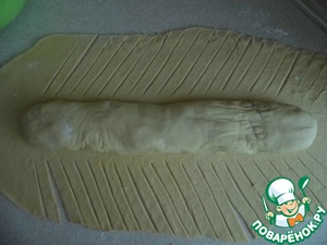 Теперь раскатываем самый большой кусок теста в большой овал. Кладем в центр рулет с начинкой, а на овале делаем надрезы как на фото примерно сантиметр шириной.