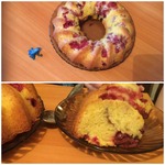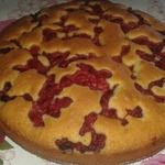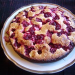 Сверху на тесто в произвольном порядке высыпаем ягоды, некоторые всаживаем поглубже ( в процессе выпекания они окажутся внутри пирога, будет очень эффектно выглядеть)