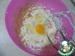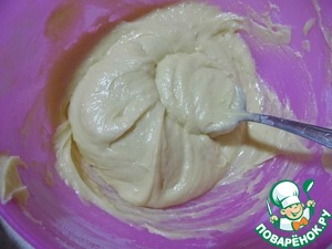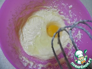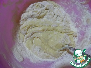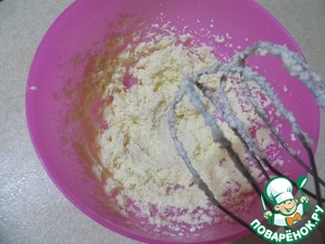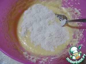 Муку смешиваем с разрыхлителем теста и по чуть-чуть всыпаем в смесь.