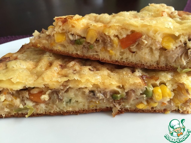 Берём форму с бортиками, у меня круглая, 26 см в диаметре и 6 см высота бортиков. Выстилаем бумагой для выпечки (будет удобнее доставать), немного смазываем слив. маслом или подсолнечным. Выливаем в форму 3/4 теста, сверху равномерно распределяем начинку и заливаем оставшимся тестом.