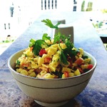 Добавьте в салат 2 ложки оливкового масла, йогурт, горчицу, табаско, паприку и карри. Все хорошенько перемешайте.