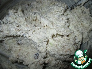 • Заранее отваренную гречневую крупу пробить в блендере. Получится некая замазка)))Добавить её в творог с яблоками. Запаренный изюм промыть, откинуть на дуршлаг. Дать воде стечь и отжав всыпать в творожную массу. Добавить сахар.