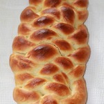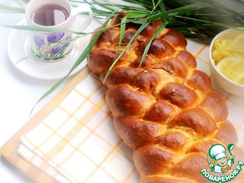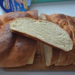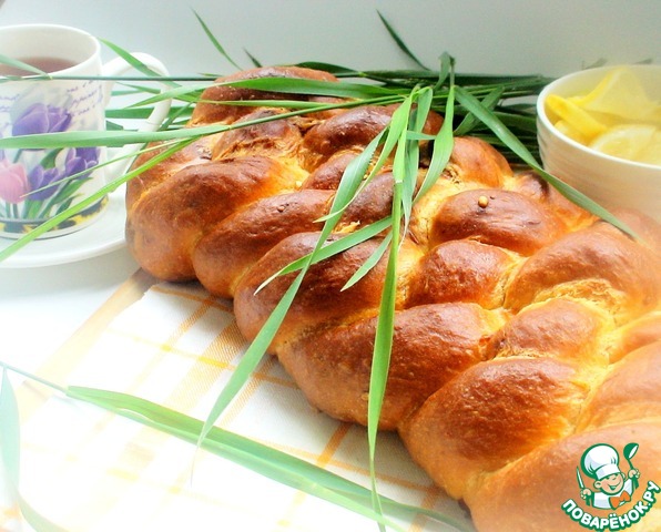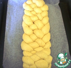 • Теперь плетем косичку, это уже опять кто как хочет, у меня из 5 прядей. Получается вот такая коса. Смазываем яйцом, смешанным с молоком, поставить на расстойку на 30 минут, выпекать в разогретой духовке до 180 градусов.