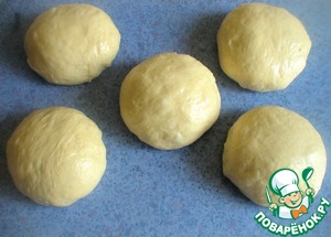 • Пока тесто отдыхает, натереть на крупной терке сыр. Тесто делим на 5 равных частей. Подкатываем в колобки.