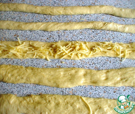 • Каждую часть тонко раскатать в длину около 40 см и ширину около 8 см. ( у меня меньше)Для сырной косички: один край посыпать сыром и скатать в жгут.