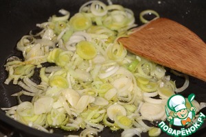 Порей промыть, порезать тонкими колечками. Чеснок порезать лепестками, с лимона снять цедру. В сковороде, где обжаривались рульки, на небольшом огне потомить порей с чесноком, добавить лимонную цедру.