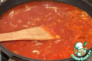 Добавить к порею томаты, предварительно измельченные в блендере вместе с соком, горячий бульон или воду и сахар.