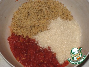 Пюре из черешни и лимона смешать с сахаром и молотыми орехами.