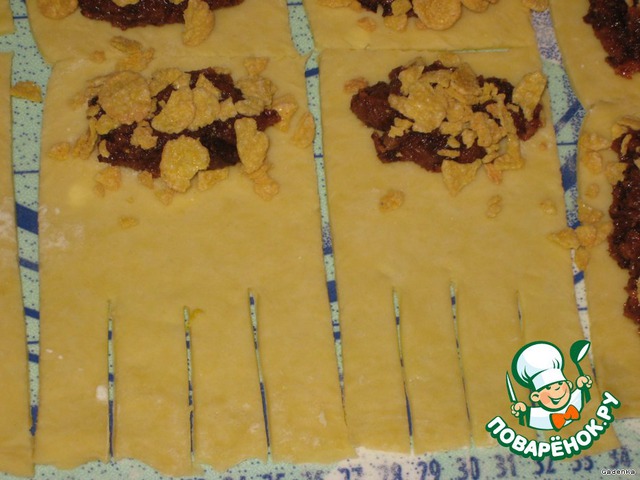 Положить начинку на середину, немного разровнять, присыпать кукурузными хлопьями.