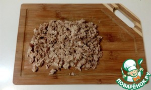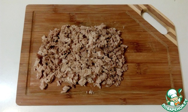 Делаем начинку. Все ингредиенты режем очень мелко. Отварную свинину режем мелко и кладем в миску. Колбасой заменять не советую потому, что мясо лучше прилипает к батону и как-бы "склеивает" начинку.