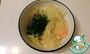 В миску добавляем яйцо, зелень и перемешиваем. Начинка должна получиться сухой но клейкой.