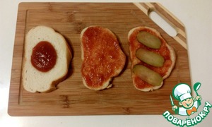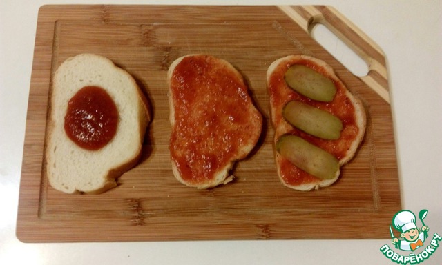 На батон мажем кетчуп не жалея, кладем огурчик. Кладем ложку начинки и большим пальцем левой руки и ложкой придавливаем начинку к батону. Много начинки не стоит класть, чтобы она хорошо прожарилась.