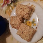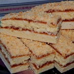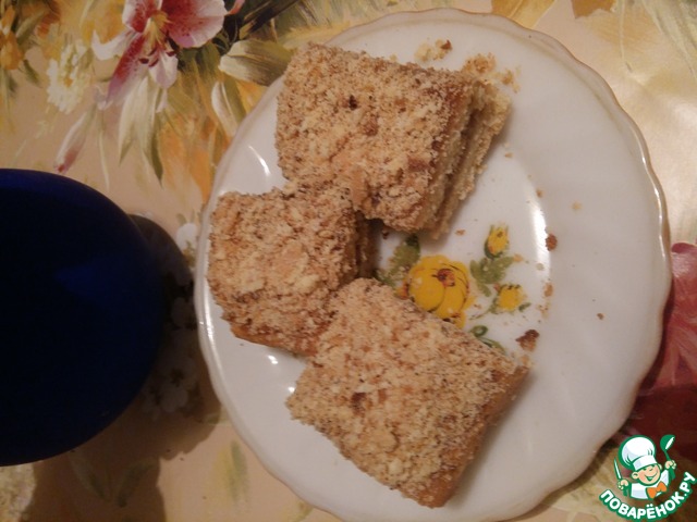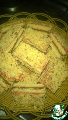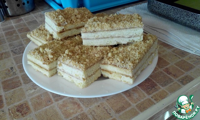 На первый слой коржа нанесла абрикосовый джем густой (можете сварить яблочное повидло по старинке). Накрыла вторым коржом, снова слой джема. И наконец хорошенько посыпать крошкой от обрезков. Я сразу нарезала на пирожные.