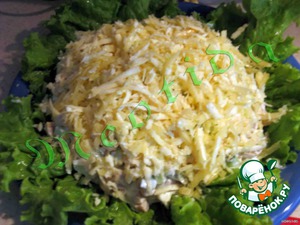 Выкладываем на листья салата сначала яично-грибной слой, а на него - кукурузно-огуречный (горкой).