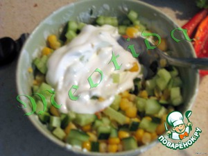 Огурец порезать мелкими кубиками, смешать с кукурузой и оставшейся сметанно-горчичной заправкой
