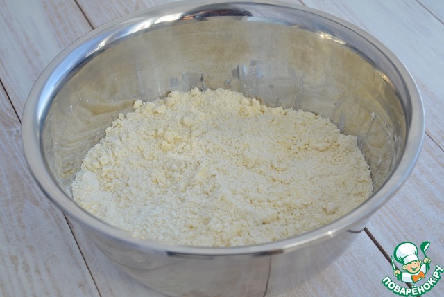 Сначала сделать тесто. Для этого просеять муку, в муку нарезать кусочками масло из холодильника и перетереть в крошку, я это делаю руками, можно порубить ножом.