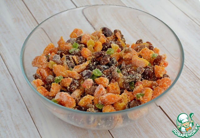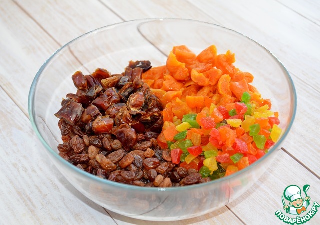 Промытые и высушенные сухофрукты порезать, кроме изюма, у меня цукаты были крупноваты, я их тоже порезала. Курагу и изюм заранее запарила в кипятке на 15 минут и просушила. Залить сухофрукты коньяком и отставить.