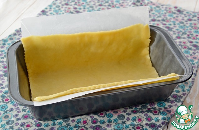Теперь нужно сформировать "стенки" пирога. Для этого форму для кекса размером по верху 26/12 высотой 6 см застелить кусочком пергамента (можно этого и не делать если уверены, что к Вашей форме ничего не прилипает). Взять примерно 230 г теста, раскатать размером 26/23 см и уложить в форму