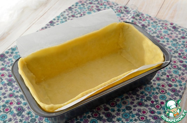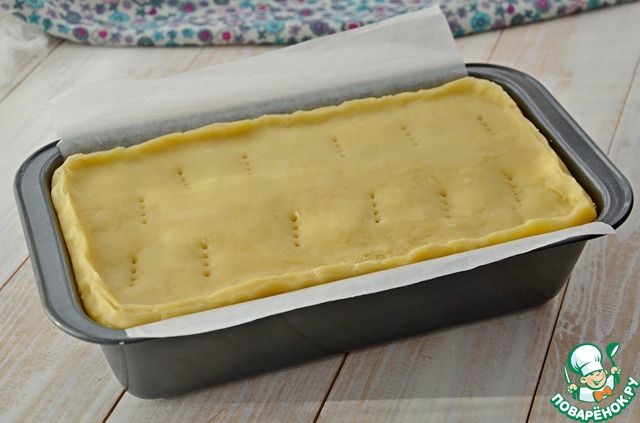 Оставить 160 г теста для верха, а из остального сделать боковины пирога, хорошенько соединить с основным кусочком теста в форме.