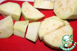 Баклажан очистить от кожицы, нарезать на куски и по возможности освободить от семян.
